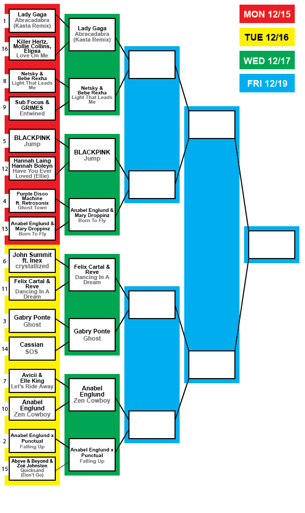 We move to the quarterfinals tomorrow, with Anabel having three songs out of the eight. The only thing that is guaranteed to stop her will be in round 4, when she will have to battle herself. We also have two big pop hits that will have to take on some Drum & Bass.